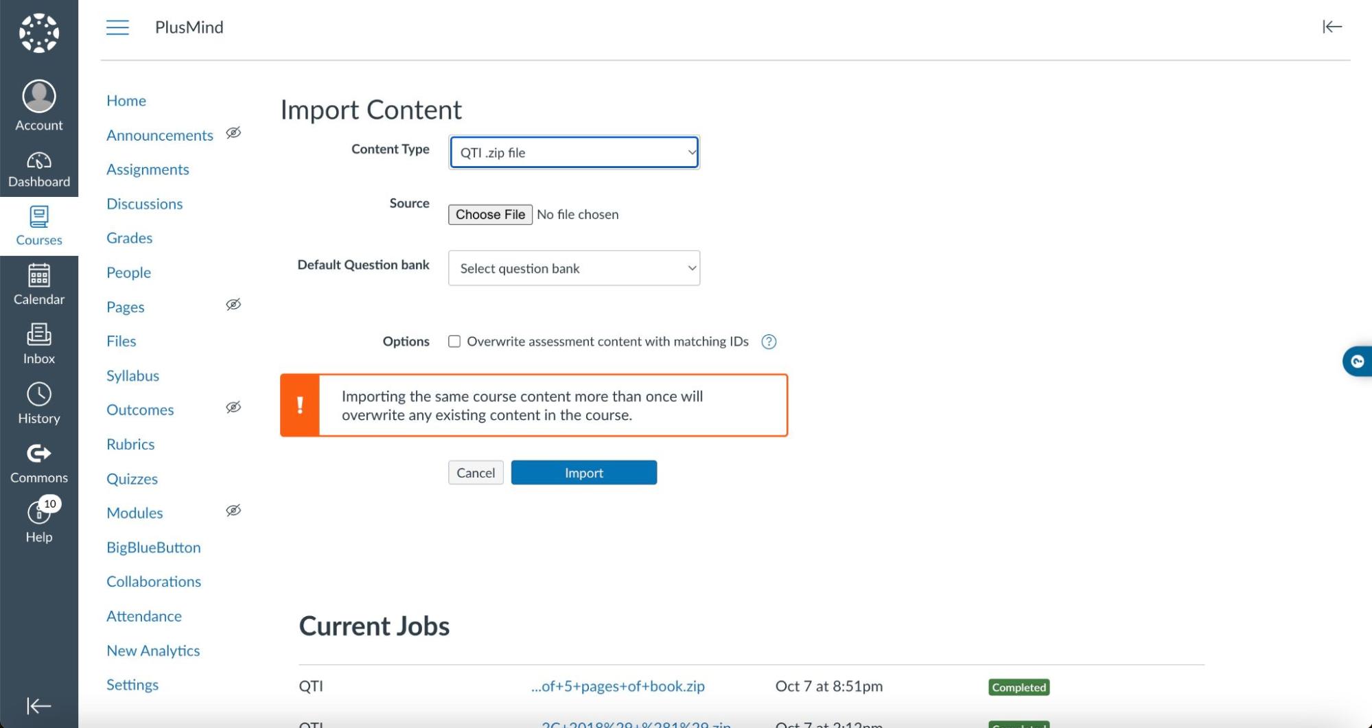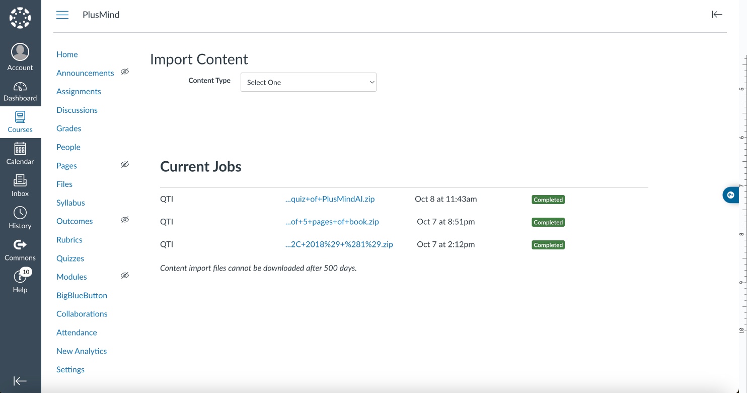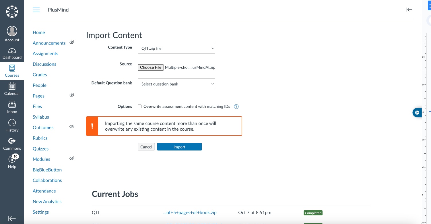 Cet article vous guidera pour importer votre fichier zip QTI dans Canvas. Notez que cet article ne couvre pas le processus de création d'un fichier QTI avec PlusMind AI. Pour cela, consultez la FAQ de PlusMind AI. Allons-y.
